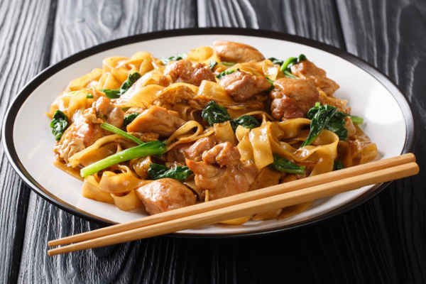 Wok fried spicy flat noodles with egg, basil leaves, bamboo shoots…