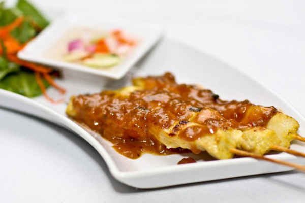 Marinated chicken grilled on skewers and served with peanut sauce.